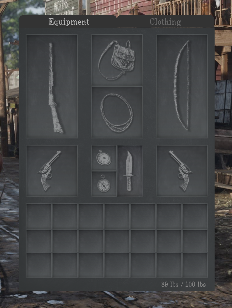 Wanting characters to carry a reasonable amount of items, have a reason to use saddle bags and smaller bags on their person the initial design for this system will be relatively restrictive in grid size. We do not want characters hauling around cases of amunition, or weeks worth of food on them. They should not have an arsenal of weapons on them or be able to carry a minecarts worth of gold out of the mines without the assistance of wagson, horses or other helpers.